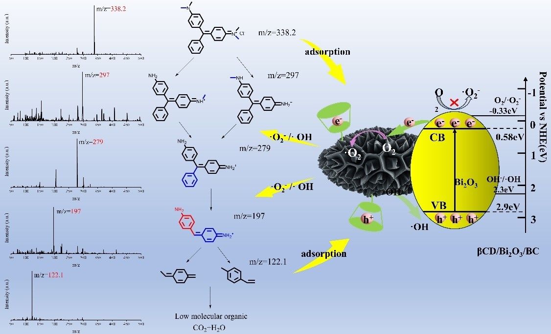 对染料污染物吸附及光催化降解方面,课题组以玉米秸秆生物炭为载体,通过共热解与表面修饰法成功构建了β-环糊精修饰的Bi2O3/生物炭复合材料,β-环糊精通过其疏水空腔增强对污染物的吸附与富集,同时调控界面电荷行为,抑制光生载流子复合,从而协同促进了污染物的表面富集与光催化转化。在可见光下,该材料对孔雀石绿展现出良好的降解效率和循环稳定性。相关研究成果以“β-Cyclodextrin modified Bi2O3/Biochar composite for highly efficient photocatalytic degradation of malachite green”为题,发表于《Applied Surface Science》(中科院SCI二区)。论文第一作者为博彩投注 武占省课题组研究生刘泽源,通讯作者为武占省教授、杨博龙副教授,西安工程大学为唯一通讯单位。