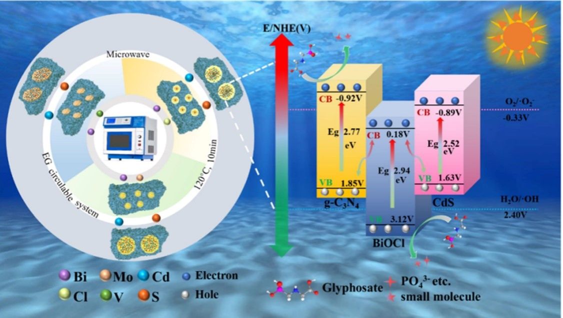 本研究针对草甘膦污染治理,提出一种绿色可循环的光催化剂制备策略。该策略以环境友好型醋酸替代传统强酸,结合乙二醇溶剂与微波技术,成功合成出铋基双S型三元异质结催化剂,并实现了溶剂的循环利用。所得材料光催化性能显著提升,对草甘膦的降解效率达到单一组分的19倍。研究成果以“Bismuth-based ternary heterojunction prepared by acetate-glycol recyclable system for excellent glyphosate degradation”为题发表于国际期刊《Surfaces and Interfaces》(中科院SCI二区)。环境与科学工程专业23级研究生王晶莹为第一作者,武占省教授为通讯作者,通讯单位为西安工程大学和西安交通大学。