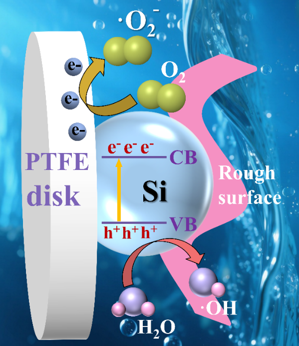 针对水体中染料污染难以高效降解的现实挑战,研究团队创新性地实现了电子废弃物——半导体工业废硅粉的资源化利用,践行“以废治废”的环保理念,并成功将其应用于罗丹明B染料的高效降解。该成果的核心创新在于:将摩擦电荷转移机制与电子跃迁(electron jumping)机制有机结合,在低频机械摩擦驱动下,实现了罗丹明B染料的高效催化降解,最高去除率达98.7%。