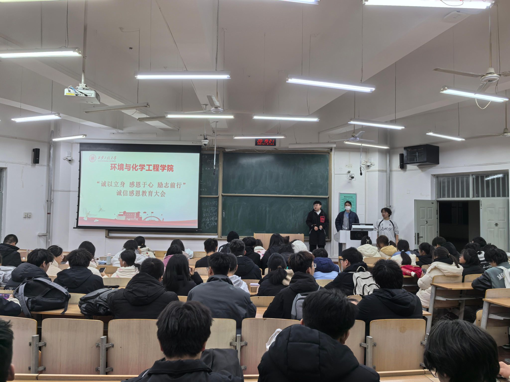 于教学楼A122召开2025年获奖受助学生诚信感恩教育大会。学院资助辅导员盖潇宇、2025级辅导员吕国正及全体获奖受助学生参会。