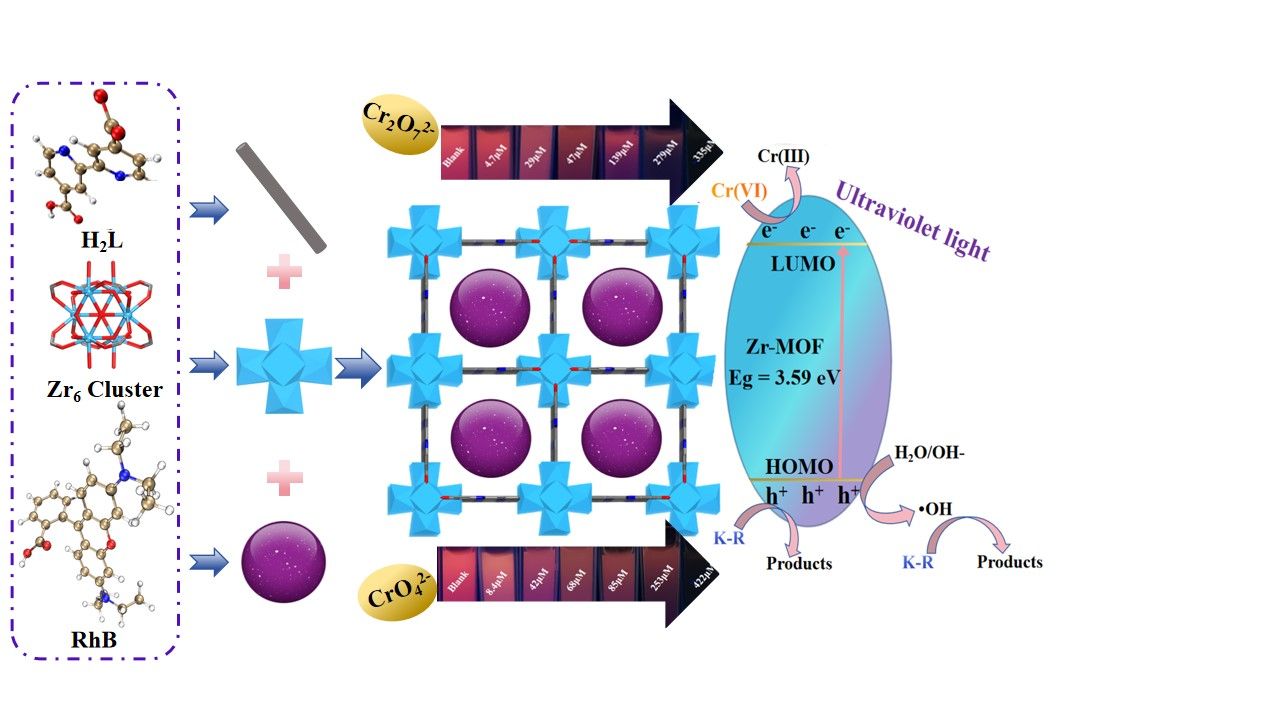 在荧光传感材料设计方面,课题组构建了新型双发射比率型荧光探针RhB@Zr-MOF,实现对Cr(VI)的高灵敏、高选择性检测。RhB分子有效抑制了聚集诱导猝灭,DFT计算证实材料荧光源于RhB分子的光致电子转移过程。此外,该材料还兼具对Cr(VI)的光还原及对活性染料的光催化降解能力。研究成果以“RhB intercalated Zr(VI)-bipyridine architecture for efficient ratiometric fluorescent response toward Cr(VI) analyte and decontamination of Cr(VI) and reactive dye via photochemical REDOX”为题发表于国际期刊《Journal of Molecular Structure》(中科院SCI二区)。化学工程与技术专业2022级研究生刘洁为论文第一作者,李庆和朱炜老师为通讯作者,西安工程大学为唯一通讯单位。