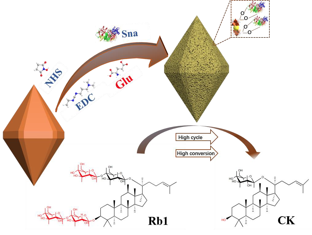 在生物催化体系构建与性能强化方面,课题组围绕酶催化过程中稳定性不足与难以重复利用等关键问题,开展了基于功能化金属有机框架材料的固定化策略研究。通过引入天然谷氨酸对铁基金属有机框架材料MIL-88B (Fe)进行表面修饰,构建新型复合载体体系,并结合共价接枝方法实现酶分子的高效固定化。该研究创新性地利用有机配体调控载体界面化学环境与空间结构,有效改善了酶分子微环境与构象稳定性,克服了传统游离酶体系在工业应用中的局限性,为稀有人参皂苷CK的绿色高效制备提供了重要技术路径。研究成果以“Immobilization of snailase on glutamate modified MIL-88B(Fe) to efficiently convert the rare ginsenoside CK with high enzyme recyclability and stability”为题发表于国际期刊《International Journal of Biological Macromolecules》(中科院一区TOP,IF 7.7),曹翠博士为第一作者,武占省教授为通讯作者,西安工程大学为通讯单位。